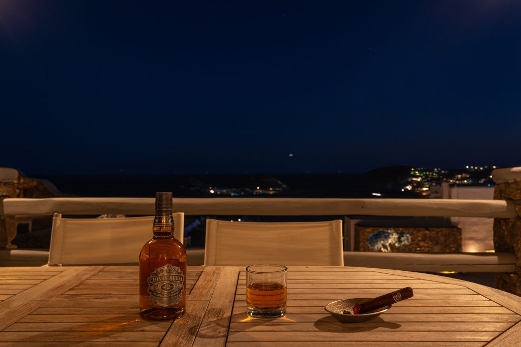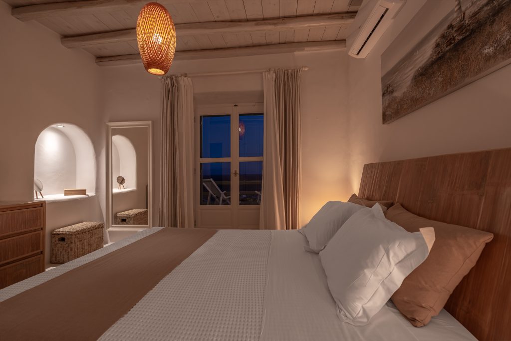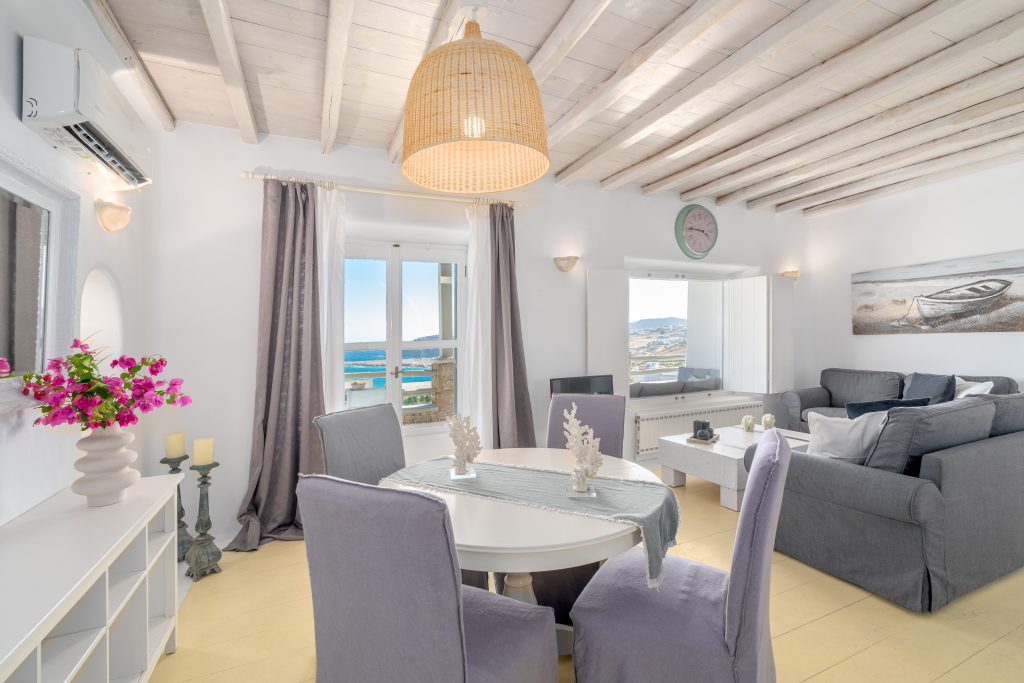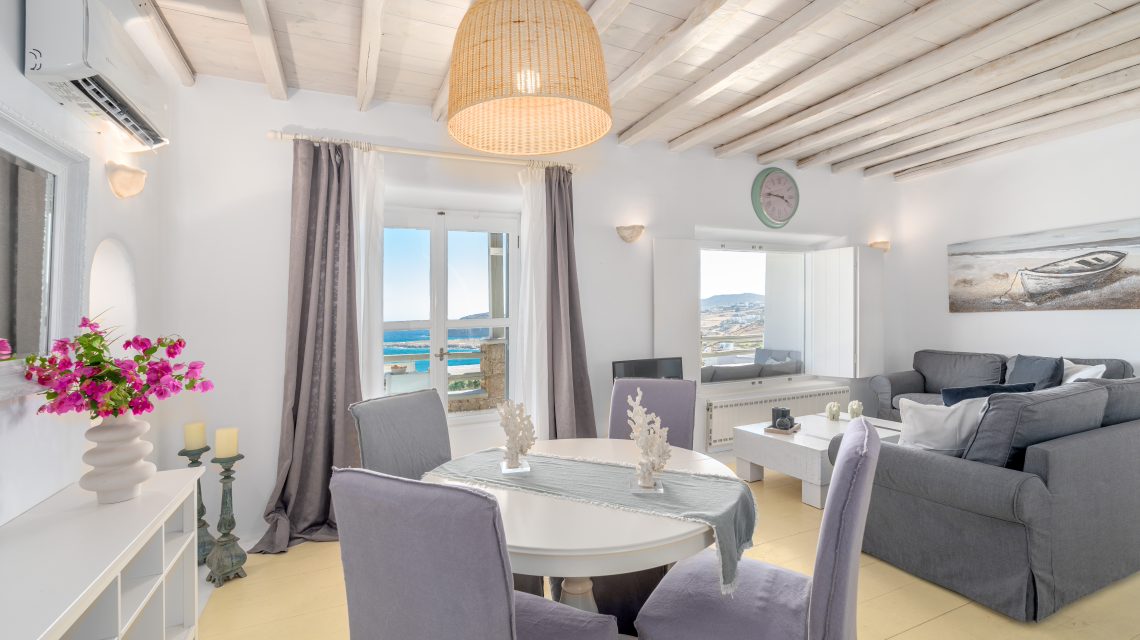 A large 80 sq m luxury apartment with a lovely private garden equipped with chaise longue and private outdoor dining with an exquisite breathtaking view of the Aegean Sea.